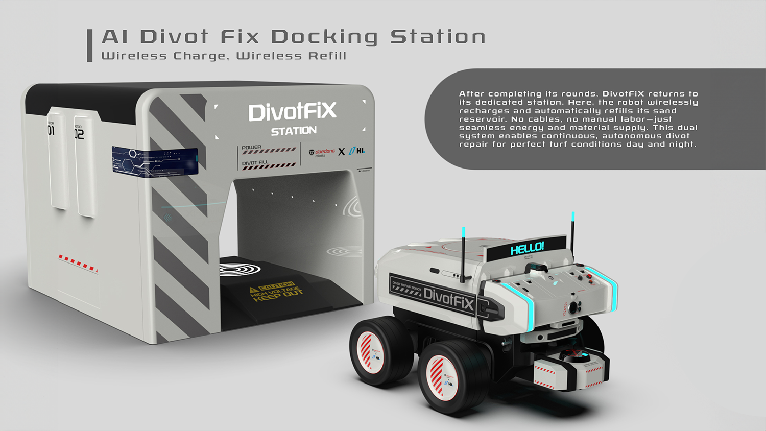 DivotFiX is the world’s first autonomous AI robot for repairing divots on golf course fairways. Equipped with AI, LiDAR, and vision-based sensors, it detects divot damage, calculates optimal repair paths, dispenses the exact amount of divot sand, and uses an integrated tamping system for restoration. Traditional repair work exposes staff to injury from golf balls and extreme heat. DivotFiX eliminates these risks, performing safe, unmanned operations both day and night. Its sensors identify people and vehicles to avoid collisions and allow golfers to play undisturbed. After each job, DivotFiX returns home to recharge batteries and refill divot sand. Managers can monitor the robot’s progress and material usage through its AI platform. DivotFiX delivers safer working conditions, lower maintenance costs, improved repair quality, and operational efficiency year-round.