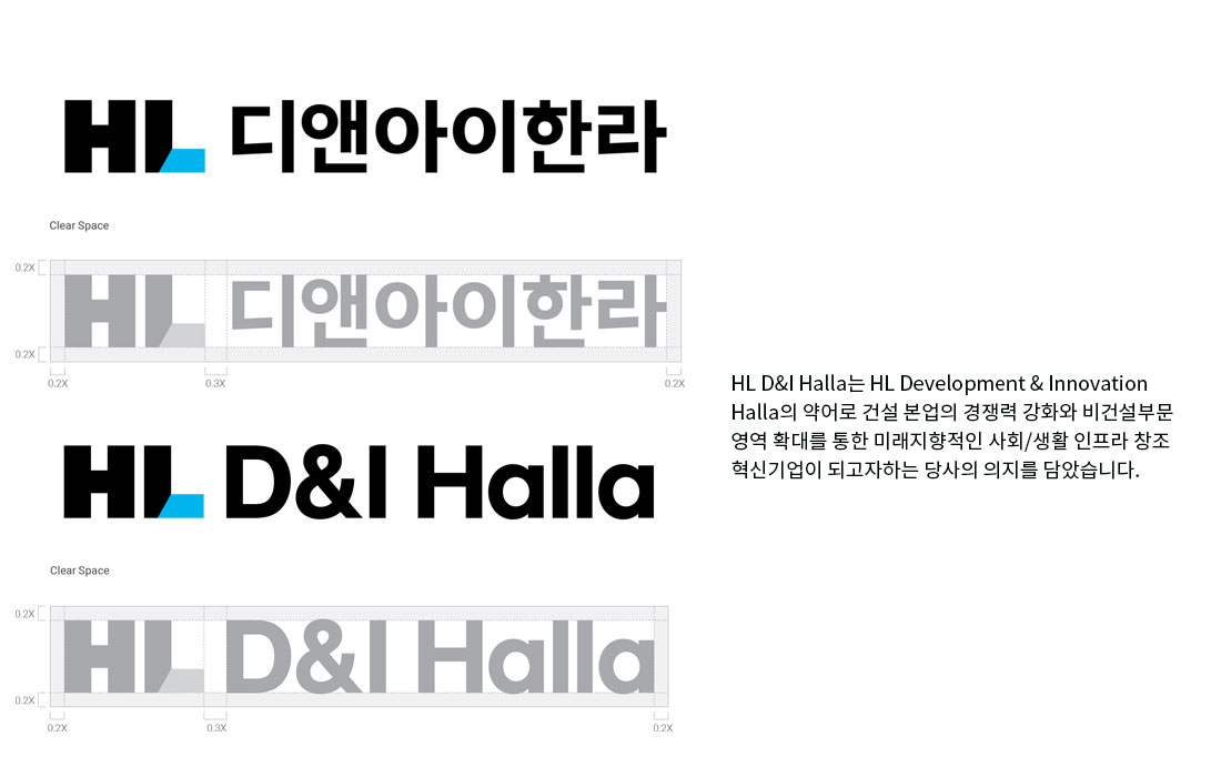 'HL'의 CI는 'Stride'라는 HL그룹의 Identity에 근간을 두고 앞으로 뻗어 나아가는 진취적인 모습과 새로운 지평을 여는 모습을 시각화하여, 담았습니다. 기존의 한라 고유의 컬러(Blue)를 계승하면서도 좀 더 미래지향적이고 강한 식별력을 지니는 색상(Sky Blue)과 우상향하는 엣지있는 그래픽 모티프를 통해 담대함과 혁신성을 나타냅니다.