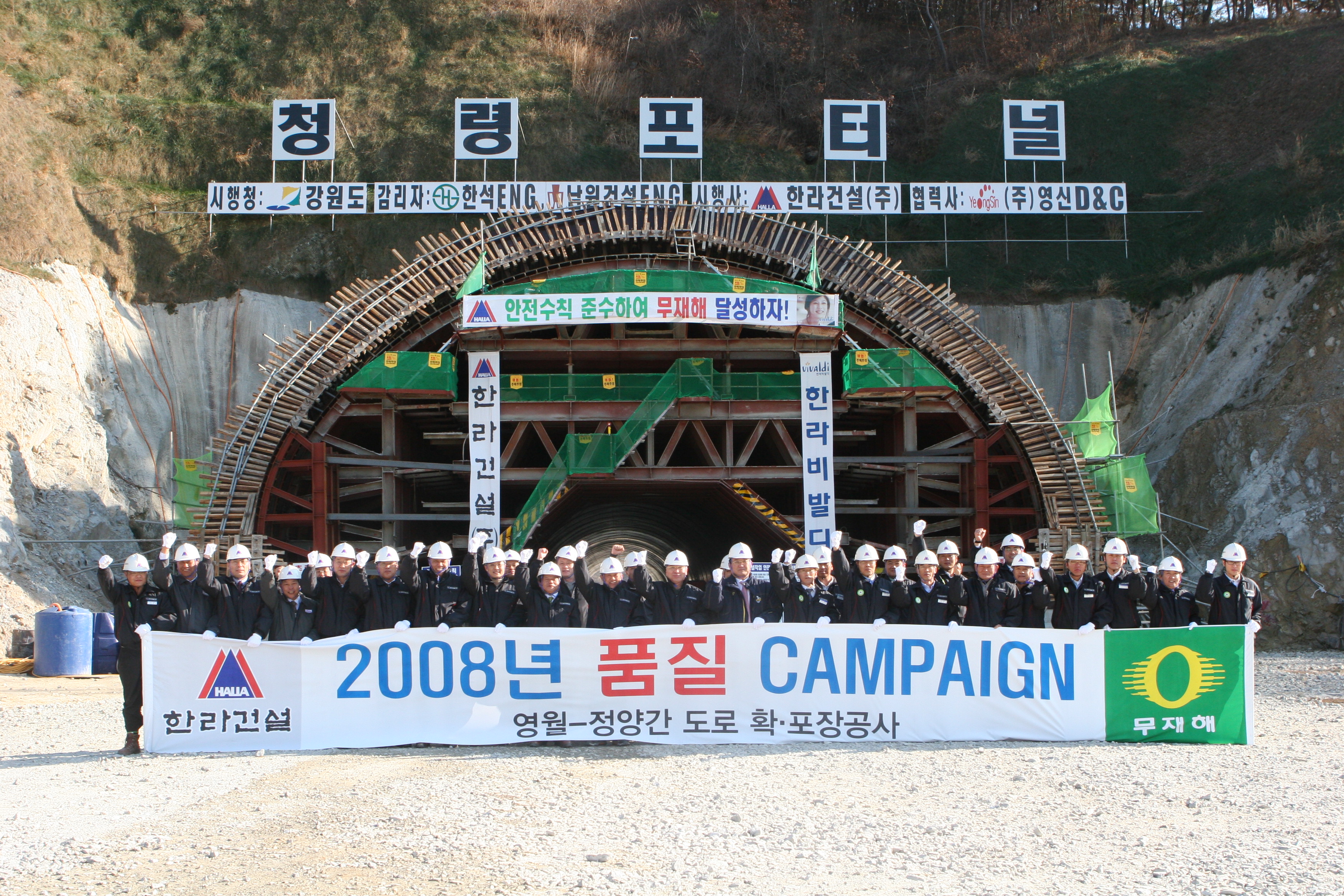 지난 11월 18일 영월~정양간 도로 확·포장공사 현장에서 정몽원 회장, 김홍두 사장 그리고 임직원과 협력업체 대표들이 참석한 가운데 품질캠페인이 개최되었다. 고객지원부 주관으로 두 번째 실시된 이번 행사는 신현수 부장의 도입배경 및 기대효과 보고에 이어 이영기 소장의 공사현황, 주요 구조물 소개 및 품질개선사례 설명으로 진행되었다. 추운 날씨에도 참석자들은 주요 구조물(팔괴터널, 하송교, 청령포 터널 등)로 이동하며 세심하게 현장점검을 하였으며, 품질점검 결과 총평으로 행사가 마무리 되었다. 이날 정몽원 회장은 어려운 시기에 흔들리지 말고 중심을 잡고 나아가야 하며 협력업체의 중요함을 거듭 강조하였다. 또한, 작은 것에 충실하면 큰 것도 잘할 수 있을 것이며 특히 토목은 발주처와 민원이 중요하므로 지속적으로 품질향상에 주력하여야 한다고 강조하였다. 한편, 김홍두 사장은 미국발 금융위기로 인하여 전 세계가 어려운 상황이지만 전 국민이 소비자인 토목현장은 경쟁사보다 고품질이면 걱정 없을 것이라고 하였으며, ‘급할수록 돌아가라.’는 말처럼 기본에 충실하여 품질에 주력할 것을 당부하였다. ■ 영월~정양간 도로 확·포장공사는 4차선 6.24km, 교량 7개소 (1.252km), 터널 2개소(1.863km)이며 현재 공정률은 92%이다.