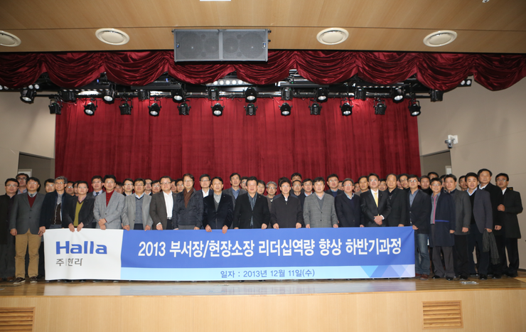 ‘2013 부서장/현장소장 리더십역량 향상 하반기과정'이 지난 11일 한라 인재개발원에서 실시되었다. 이번 교육과정은 정몽원 회장의 특강을 시작으로 바이오벤처 기업 에이티젠 박상우 대표의 '전략적 의사결정과 신규사업 추진 필요성', 하컨펌홀딩스 하명기 대표의 '불확실한 미래를 대비하는 생존전략' 강의가 진행되었으며, 최병수 사장의 특강으로 마무리 되었다.